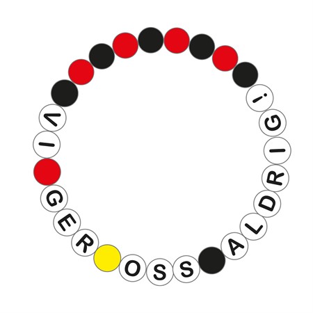Budskapsarmband med texten VI GER OSS ALDRIG.